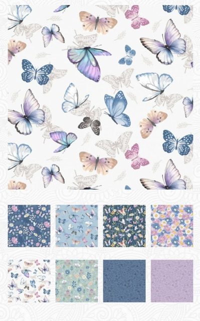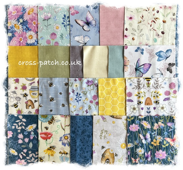 Pack of 42 squares of 5” of pretty fabrics with butterflies, bees and pretty flowers with some Makower blenders.