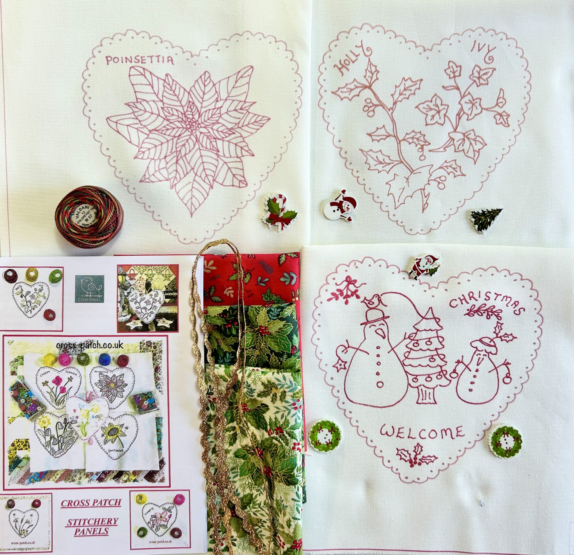 Pack of 3 Christmas stitchery heart panels, 6 buttons, gold ric rac, 3 Xmas fabrics for backing and a ball of Valdani M57 variegated thread!