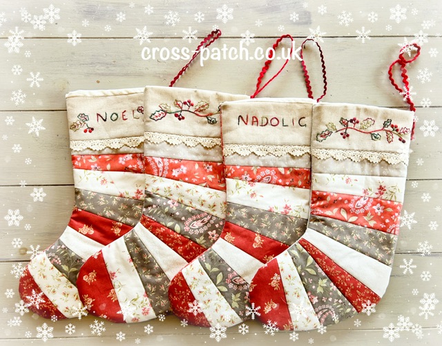 2 different styles of stockings- either a pieced applique stocking or a strippy stitchery stocking-instructions with a full size stocking template- stocking is approx 15” long and 6.5” wide at the top.