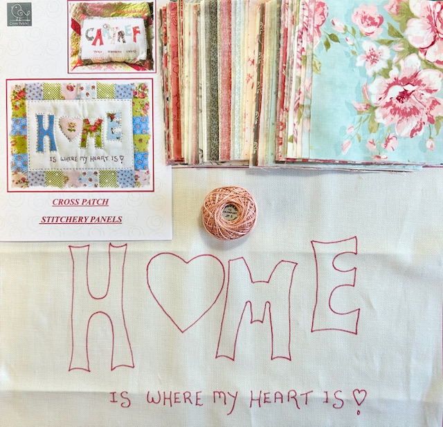 Kit includes printed panel, ball of Valdani perle thread and a charm pack of gorgeous Moda fabrics- 76 squares of 5”- you will need to cut some of these down to 2.5” for the cushion borders