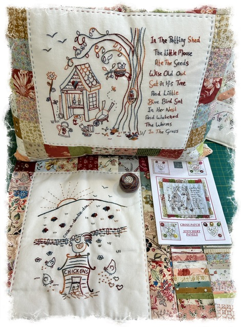 Stitchery panels to make the potting shed and Rise & Shine with a ball of Valdani thread and a mini charm pack of 70 squares.