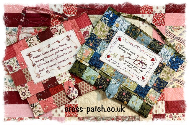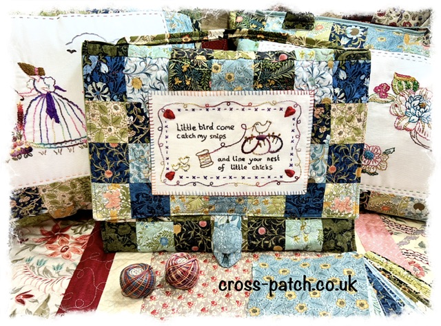 Instructions to make this cute sewing satchel with 3 traceable stitcheries for sewing machine, little bird, needles and bobbins. Easy to adjust the size but you will need 120 squares of 2.5” to make the William Morris version or cut a charm pack into 2.5” squares.