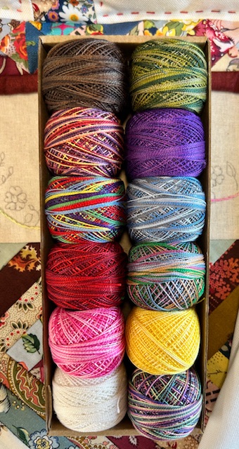 A beautiful collection of 12 balls of perle 12 thread as used to stitch our flower hearts.